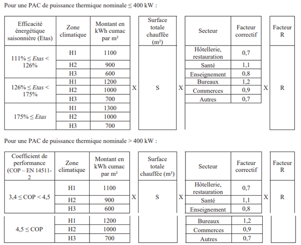 pour les PAC ≤ 400 kW : le type de PAC (basse, moyenne ou haute température) ;